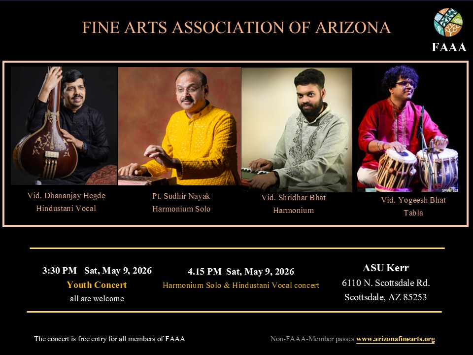 Fine Arts Association of Arizona proudly presents Harmonium Solo by Pt. Sudhir Nayak, Hindustani Vocal Concert by Vid. Dhananjay Hege and team.