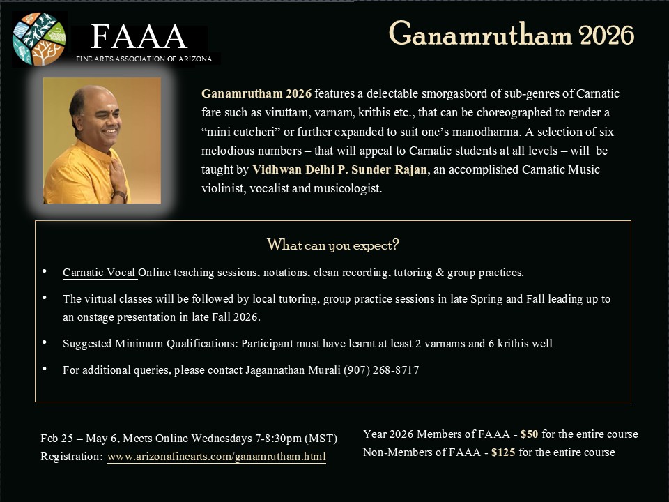 Fine Arts Association of Arizona is excited to bring a unique learning opportunity with Vidhwan Delhi P. Sunder Rajan.